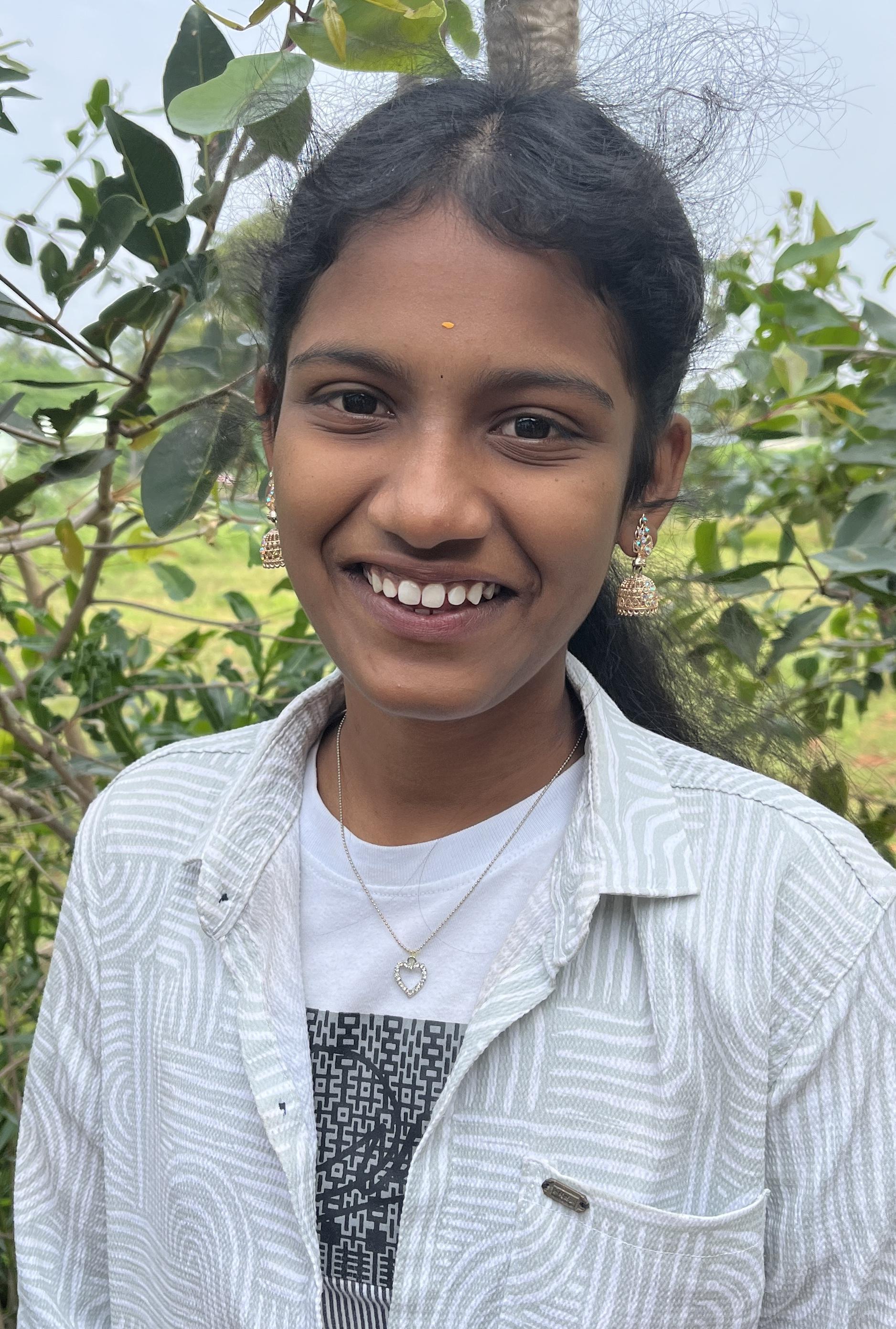 is net als Bharani shri een van de buren van Ashok en zijn familie. Ze is zeer verstandig en leergierig en zoals haar mama heel goed bewust dat het enkel met studeren is dat ze een betere toekomst zal kunnen verwerven Daarom gaat ze naar een privéschool die beter onderwijs geeft maar ook duurder is. Haar sponsorouders betalen niet de volledige schoolkost maar hetzelfde bedrag wat betaald wordt voor de sponsorkinderen van de Eraniyam basisschool. Enkele jaren geleden is haar papa gestorven. Hartaanval.